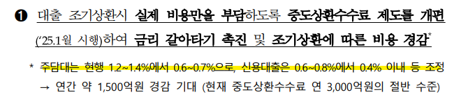 중도상환수수료는 대출자가 대출금을 일찍 갚을 때 은행이 부과하는 수수료로, 대출 잔액의 일정 비율(보통 1.2∼1.4%)이 부과됩니다. 이번 조치로, 대출 중도상환수수료가 대폭 인하되어, 대출자가 대출을 조기 상환할 때의 부담이 줄어듭니다.
