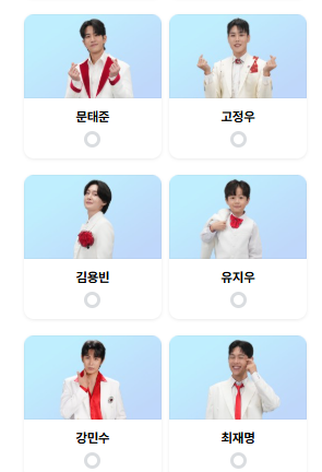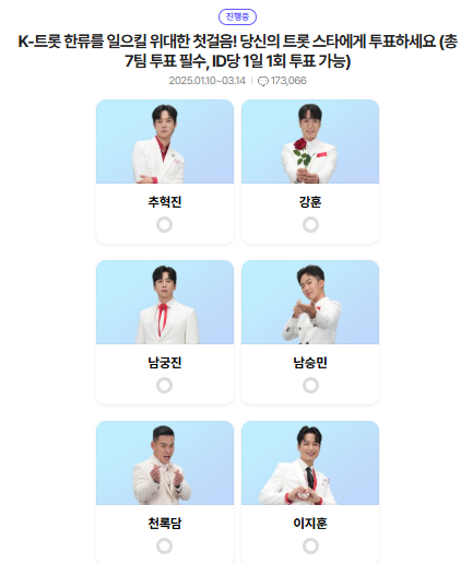 본선 3차에 진출한 24개 팀을 선택할 수 있으며 1일 1투표 7팀 선택이 가능합니다. 대국민 응원 투표 페이지는 접속할 때마다 보여지는 가수 위치가 달라니지 참고하세요.