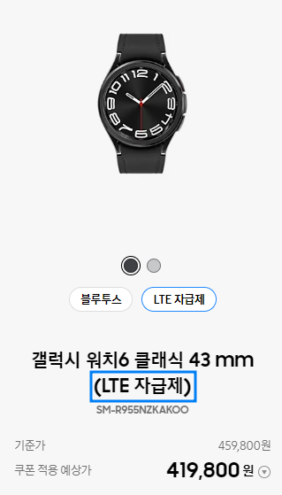 갤럭시워치6 모델은 40mm,44mm,클래식 43mm 있습니다. 가격대는 LTE자급제보다 블루투스가 저렴하게 형성되었습니다.