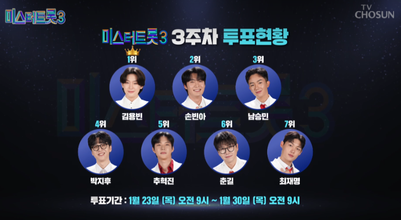 과연 오늘 미스터트롯3 7회에서 지난주 상위 7명 중 누가 자신의 위치를 유지하고, 누가 새롭게 도약하는지가 관전 포인트가 될 거 같습니다.