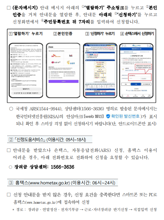 근로장려금을 사칭한 금융사기 피해에 주의하시고, 국세청에서 요구하지 않는 개인 금융정보는 절대 제공하지 않도록 유의하시기 바랍니다.