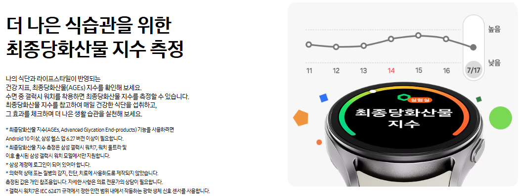 스마트폰과 연동된 삼성 헬스 모니터 앱을 통해 손쉽게 확인할 수 있습니다. 수면 중 갤럭시 워치를 착용하면 최종당화산물 지수를 측정할 수 있습니다. 최종당화산물 지수를 참고하여 매일 건강한 식단을 섭취하고 효과를 체크하며 더 나은 생활 습관을 실천이 가능합니다.