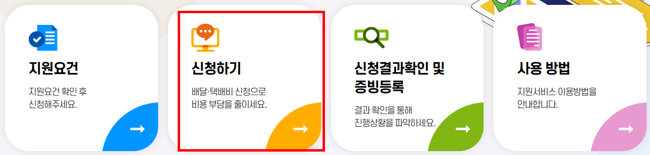 배달앱(배달의민족,요기요 등) 사용자는 간편하게 신청 가능하며, 직접 배송을 하는 세탁소, 꽃집, 도시락 가게도 증빙 자료를 첨부해서 지원을 받을 수 있습니다.