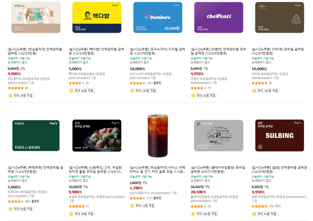 쿠팡트래블 쿠폰은 여행·숙박·레저 상품 전용이라고 오해되지만 실제 활용 범위가 더 넓다. 트래블의 ‘티켓/패스’ 메뉴에서는 커피,치킨,영화 등의 기프티콘(모바일 쿠폰)이 판매되고 있다. 스타벅스, 투썸, BHC, BBQ, CGV 등 약 50여 종의 프랜차이즈 기프티콘을 구매할 수 있어 여행 계획이 없어도 일상 속에서 사용할 수 있다. 트래블 쿠폰은 실생활 활용도가 낮다는 비판이 있었으나 기프티콘 구매로 실효성이 확보된 셈이다.
