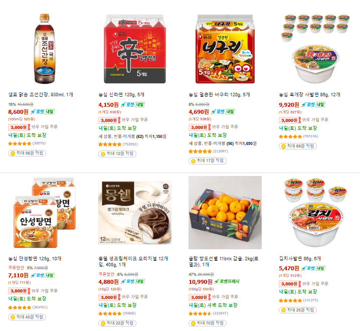 로켓배송 쿠폰은 생활용품 구매에 사용할 때 효율이 가장 좋습니다. 5천원 이하 상품이 약 14만 개 이상이라 선택 폭이 넓으며 생수, 라면, 우유, 샴푸, 주방세제 같은 생필품을 거의 무료로 구매할 수 있는 구조입니다. 실제 사용자들은 라면 묶음, 생수 묶음, 샴푸 등을 0~500원 사이로 결제했다는 후기를 공유하고 있습니다. 생활비를 절감할 수 있어 가장 실속 있는 쿠폰으로 평가됩니다.